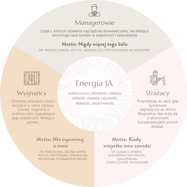 Terapia IFS polega na prowadzeniu dialogu ze swoimi wewnętrznymi częściami, którego celem jest ich zrozumieniu i zarządzaniu nimi w sposób zintegrowany i harmonijny z miejsca energii JA. Terapeuta IFS pomaga klientowi eksplorować te różne części, odkrywać ich funkcje, potrzeby i relacje między nimi. Szczególnie istotne jest to, że nie ocenia, nie daje rad czy "prac domowych" . Dzięki temu podejściu klient może uzyskać lepsze zrozumienie swoich emocji, zachowań i reakcji, a także poprawić samopoczucie i funkcjonowanie.
